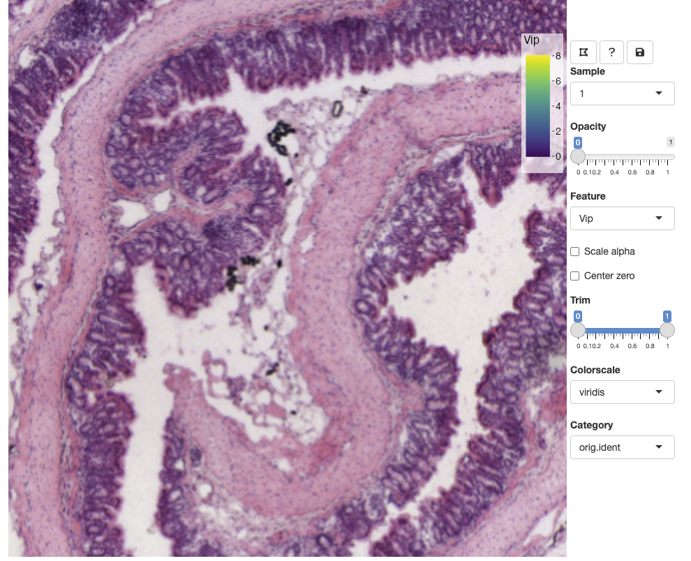 You can zoom in and out using the mouse wheel and pan by dragging clicking and dragging the H&E image. The opacity slider allows us to hide spots if we wish to view clear the view of the H&E image: