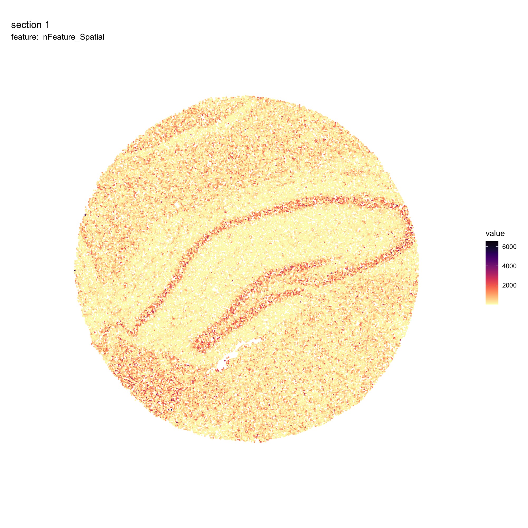 MapFeatures(slide_seq_semla, features = "nFeature_Spatial", colors = viridis::magma(n = 11, direction = -1)) & ThemeLegendRight()