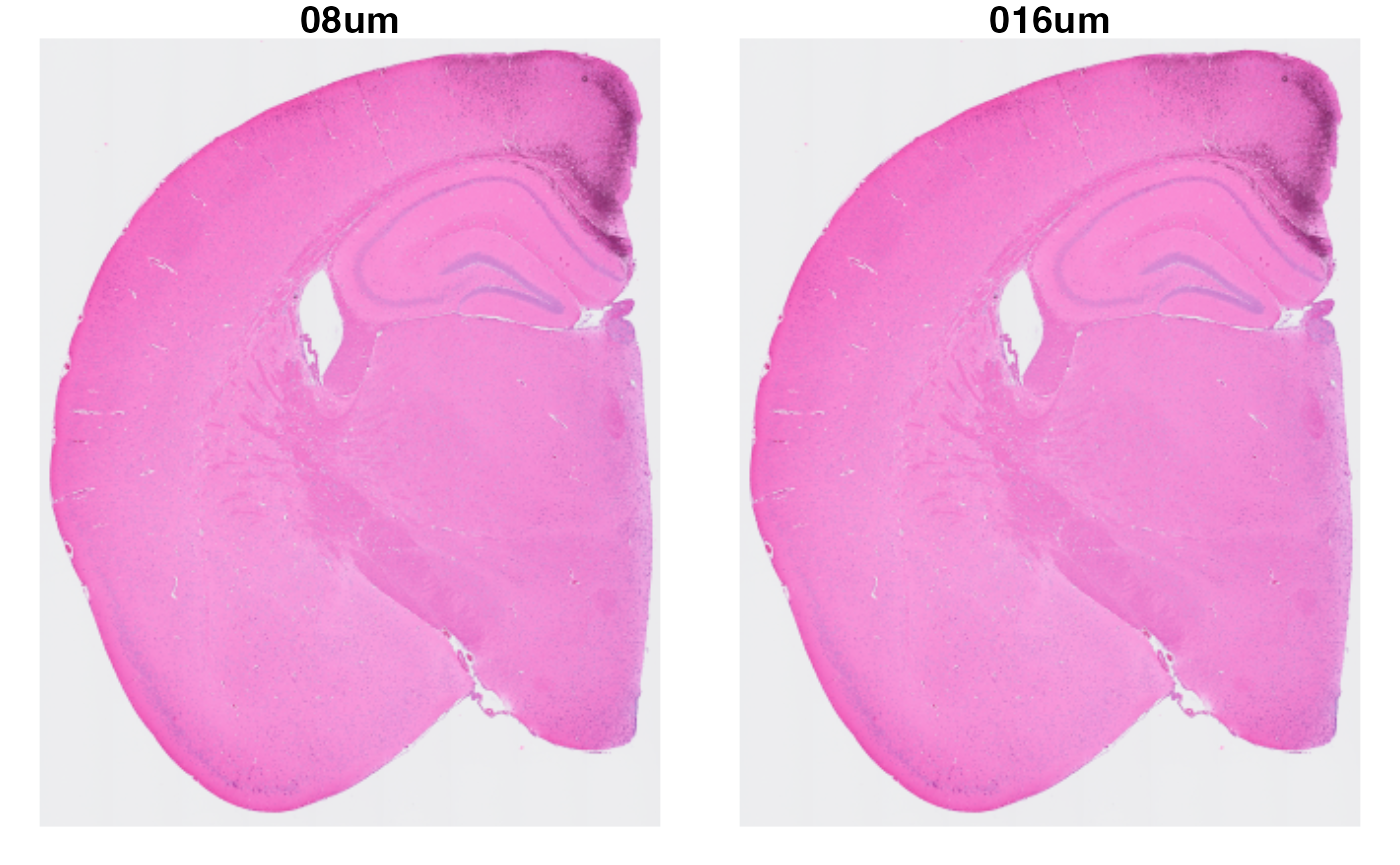 As mentioned before, now each resolution of the VisiumHD experiment is stored in the Seurat object as an individual experiment. Let’s take a look at the HE images. You can note how, even though we are labeling each image by expressing from which resolution they come from, they are exactly the same image.